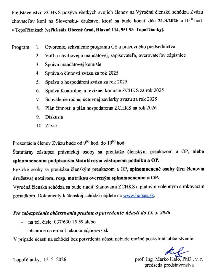 Pozvánka – Výročná členská schôdza ZCHKS, Topoľčianky 21. marec 2026